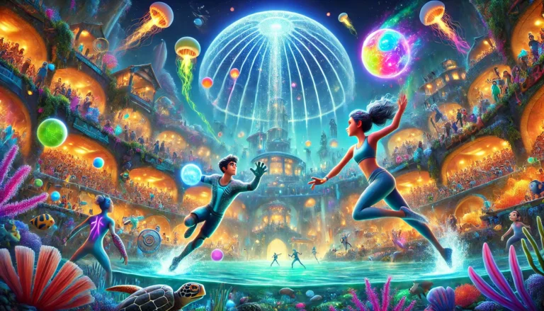 De arena was adembenemend: een gigantische bel van kristal die de oceaan binnenhield, met glinsterende planktonlichten die boven hun hoofden zweefden. De bal was geen gewone bal, maar een magische bol die steeds van kleur veranderde en onverwachte bewegingen maakte.